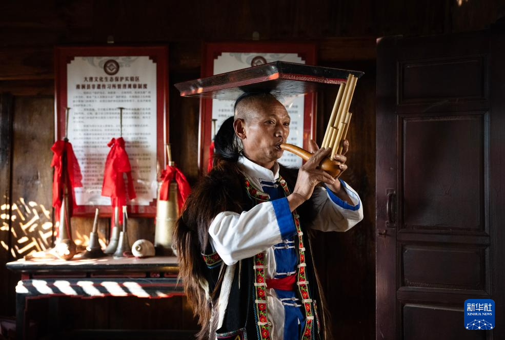 2月7日,南涧彝族跳菜国家级非物质文化遗产代表性传承人鲁朝金在非遗传习所内演示跳菜技艺。