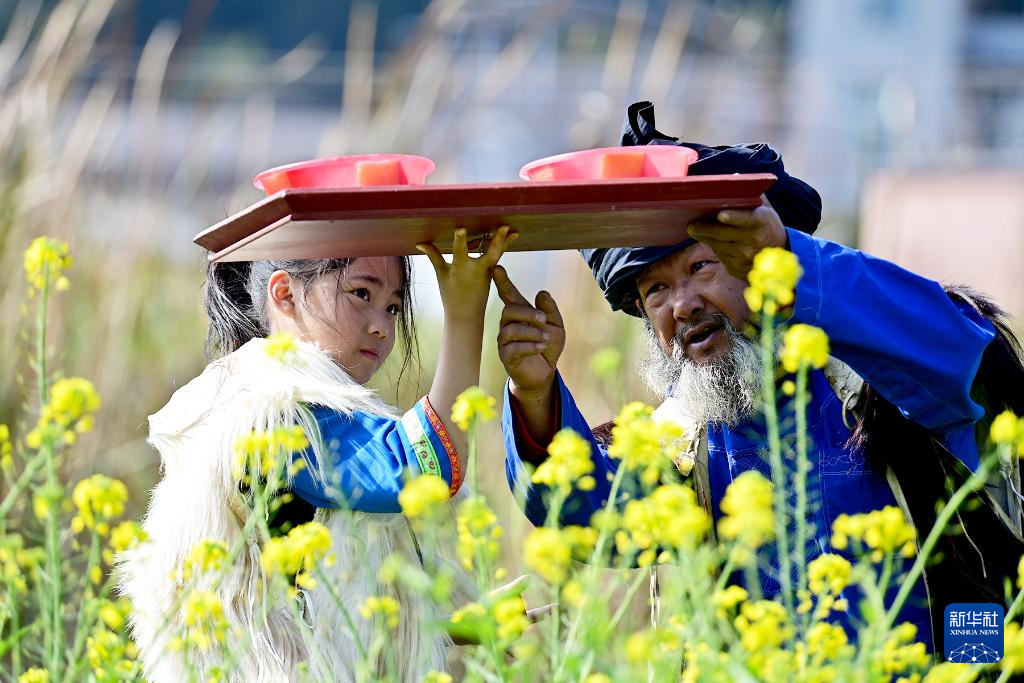 2月5日,南涧彝族跳菜省级非物质文化遗产代表性传承人阿本枝(中)在给孙辈传授跳菜技艺。