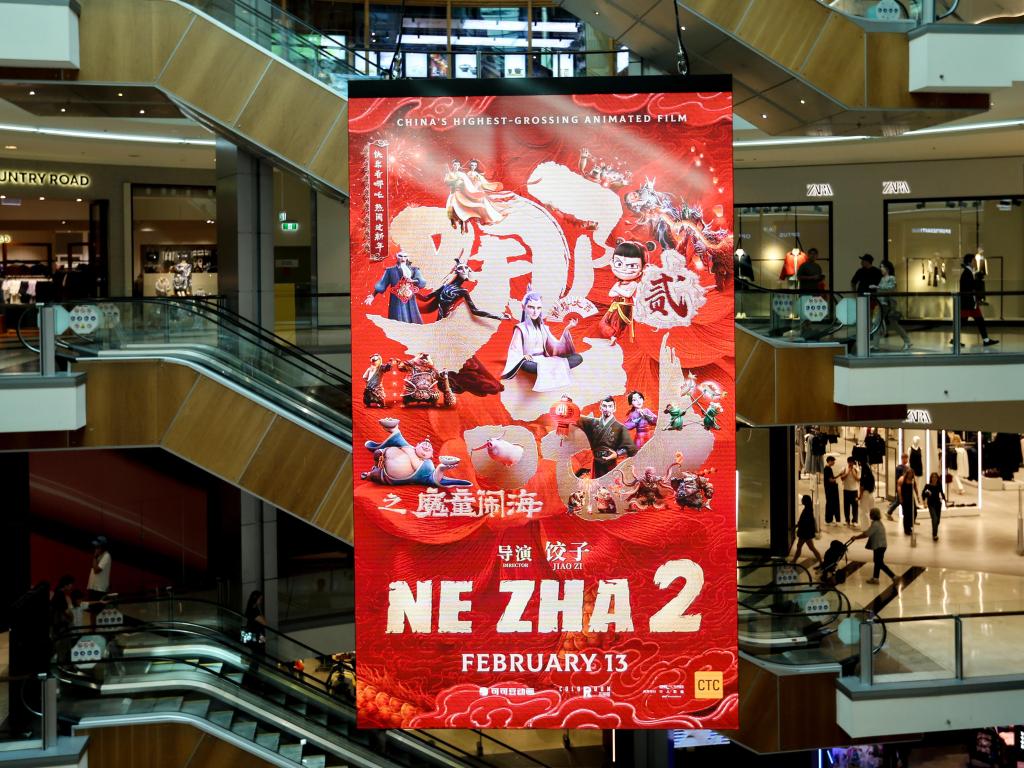 这是2月13日在澳大利亚悉尼一商场拍摄的《哪吒之魔童闹海》巨幅海报。新华社记者 马平 摄