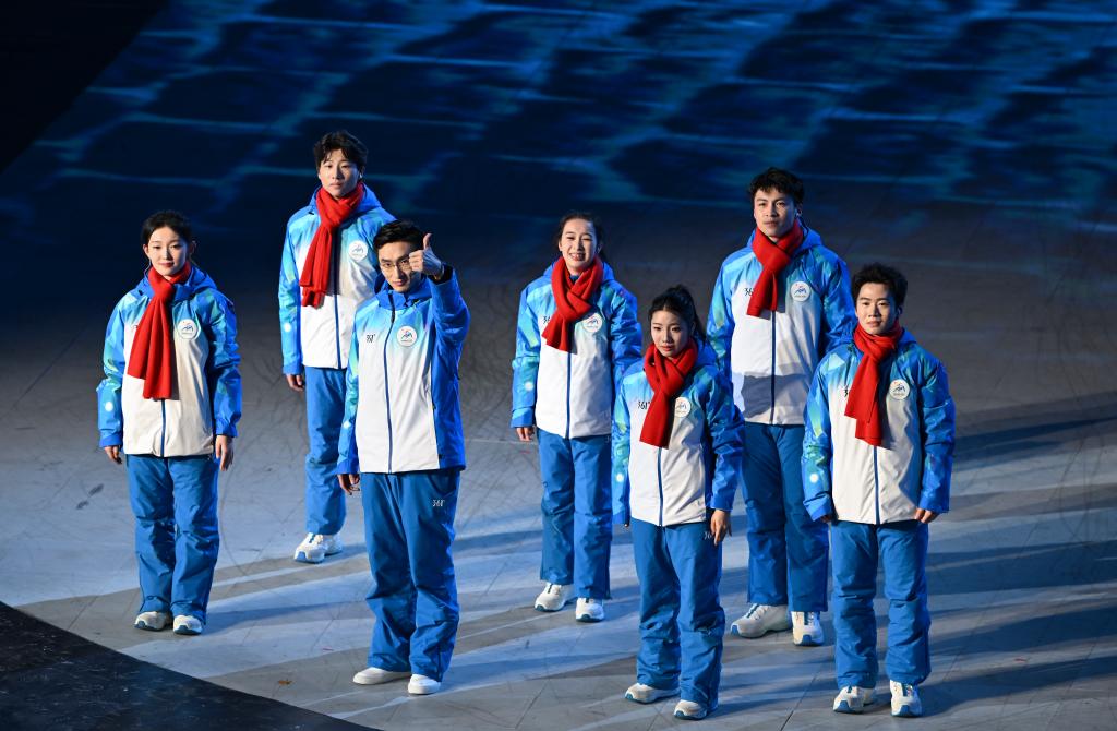 冰雪同梦,亚洲同心。在激昂的乐曲声中,各参赛代表团的旗帜入场,运动员欢聚一堂,迎接属于他们的欢庆时刻。这一刻,艰辛不再,无谓成败,人们对着镜头尽情欢呼,围着吉祥物“滨滨”“妮妮”跳起圆圈舞,满场的欢腾长达十多分钟。待运动员离场,舞台上亮出一朵如花似雪的同心结。