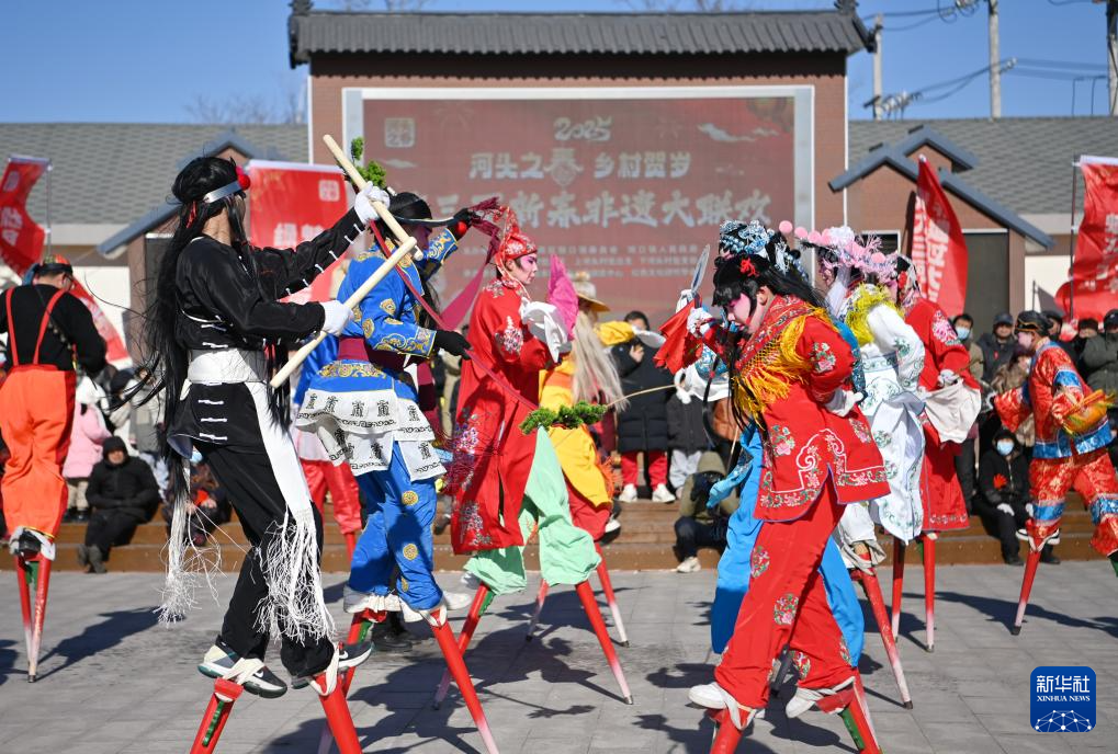 2月7日在天津市北辰区双口镇中河头村拍摄的韩家墅权乐高跷展演。