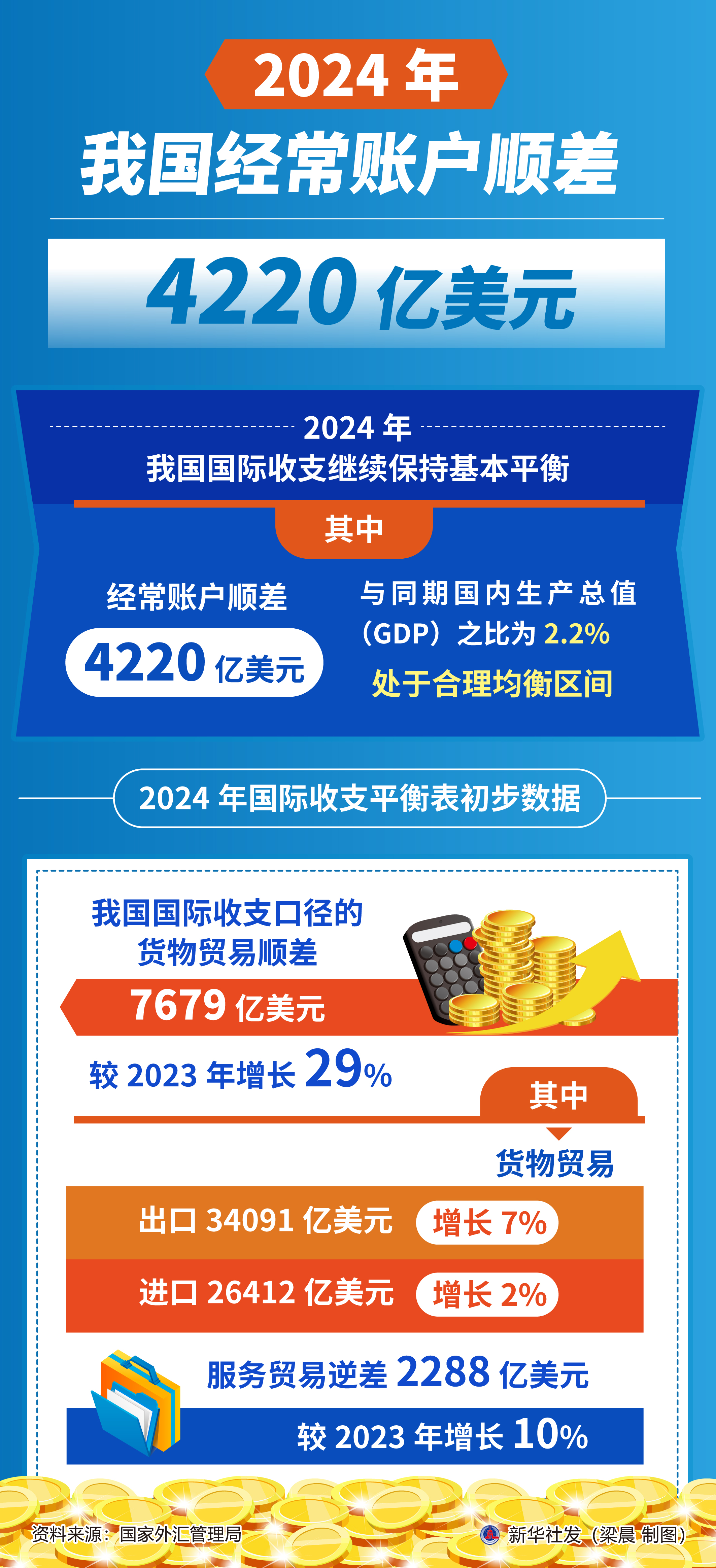 新华社北京2月14日电(记者 刘开雄)国家外汇管理局14日发布数据显示,2024年,我国国际收支继续保持基本平衡。其中,经常账户顺差4220亿美元,与同期国内生产总值(GDP)之比为2.2%,处于合理均衡区间。