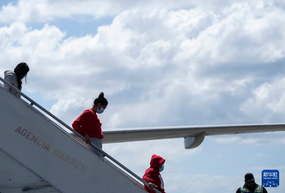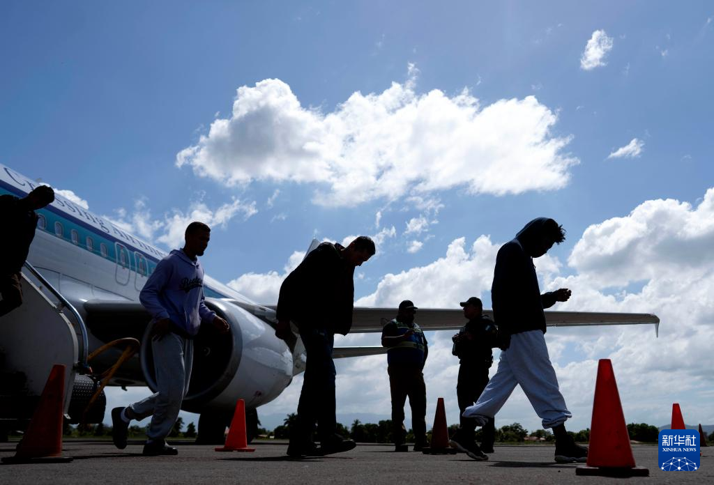2月14日,在洪都拉斯西北部城市圣佩德罗苏拉的拉蒙·比列达·莫拉莱斯机场,返乡移民走下飞机。新华社发(戴维 摄)