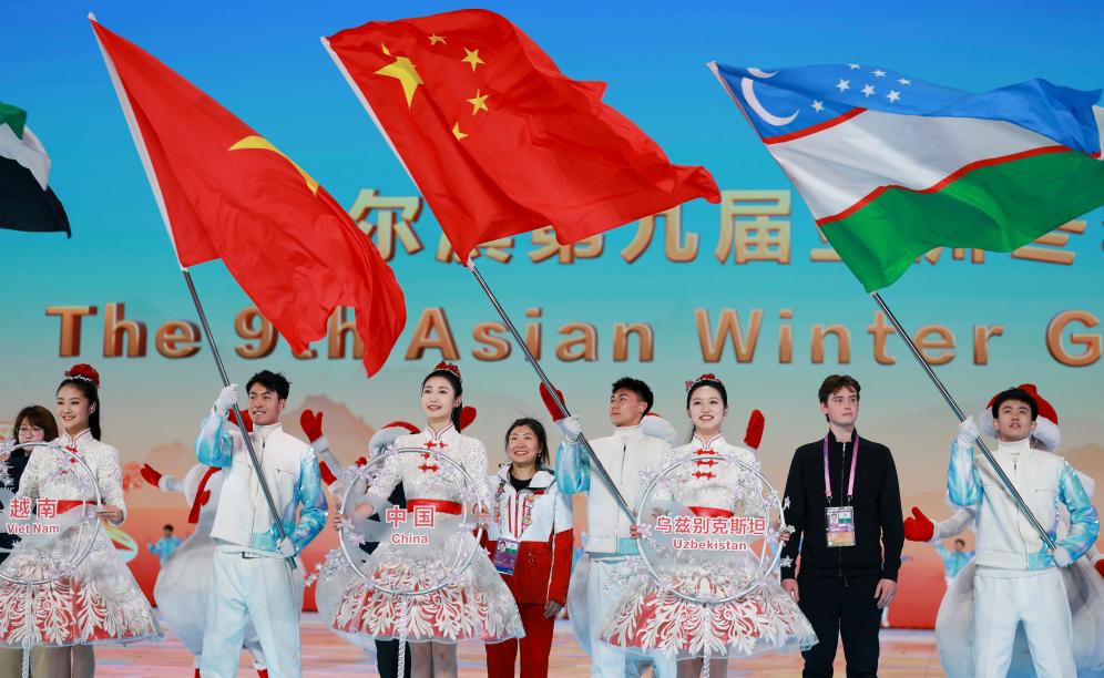 2月14日,中国体育代表团旗手徐梦桃(中)在亚冬会闭幕式上。新华社记者 张涛 摄