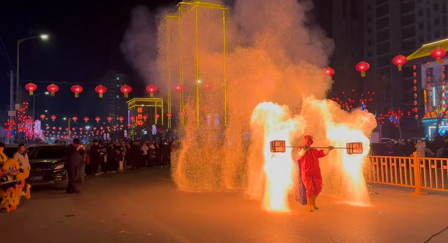 任泽区古韵街大集上演非遗绝技“火壶打铁花”。任泽区融媒体中心供图