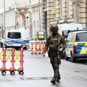 2月14日,警察在德国慕尼黑安全会议主会场外警戒。新华社记者高静摄