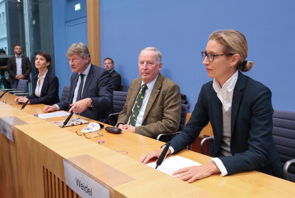 2017年9月25日,在德国首都柏林,魏德尔(右一)出席德国选择党新闻发布会。新华社记者单宇琦摄