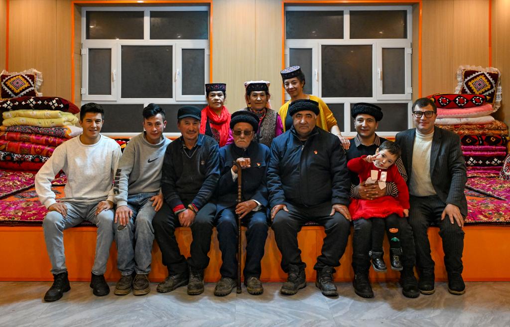 在中国-塔吉克斯坦边境地区的一处执勤点,多来提曼·开米克(右三)同本村护边员交流(2025年1月9日摄)。