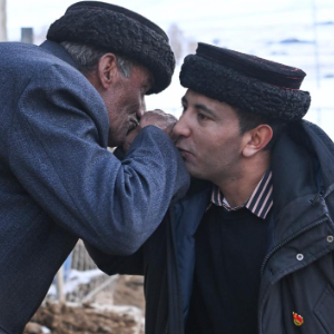 多来提曼·开米克(右)在村里走访时,与一位长者行“吻手贴面”礼(2025年1月3日摄)。