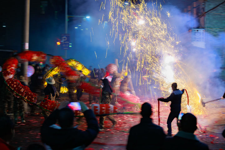 今年首个“非遗版”春节里,在河北井陉,“打铁花”“打树花”“狮子火”等非遗焰火交相辉映;广东梅州的人们在竹篾扎成的“龙身”里装入各式烟花爆竹,舞龙者手擎“火龙”,缤纷焰火从“龙身”喷出,一时间火光冲天、龙影翻腾。