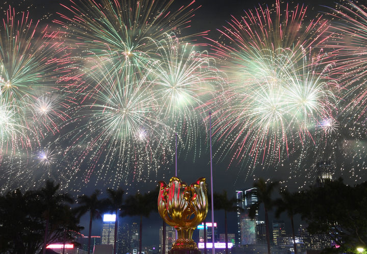 2025年1月30日,烟花在香港维多利亚港上空绽放,欢庆新春佳节。新华社记者 陈铎 摄