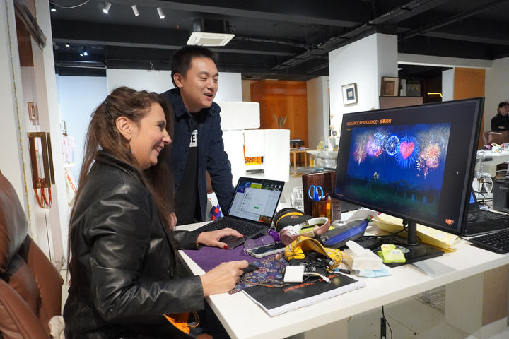 2022年12月,法国烟花设计师苏绮正与同事商量焰火情景剧设计思路。新华社记者 程迪 摄