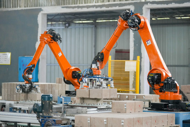 2025年1月7日,湖南省浏阳市一家花炮生产企业,机械臂在烟花产品流水线上作业。新华社记者 陈泽国 摄