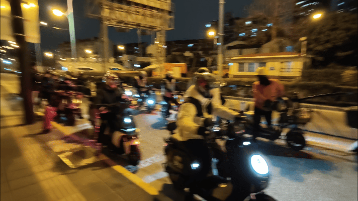 2月17日22时50分,电动自行车骑行者在排队等候复兴东路隧道上层开放。