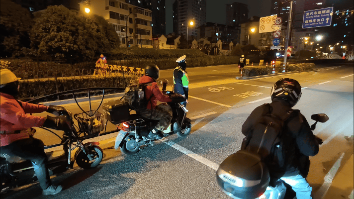 23时,交警打开了非机动车道接入复兴东路隧道的道口,并根据红绿灯指示依次放行电动自行车。从这一刻到次日5时,跨江的复兴东路隧道上层仅为电动自行车开辟。