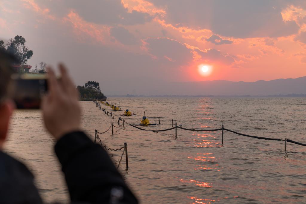 2月11日傍晚,游客在滇池畔拍摄日落。新华社记者彭奕凯 摄