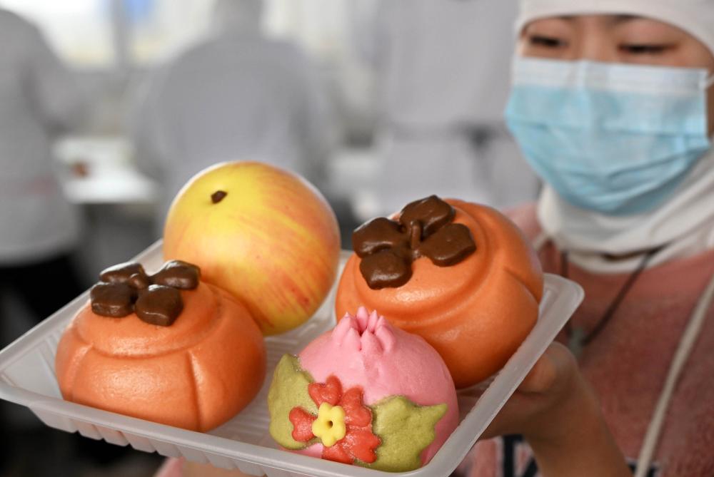 在威海益康花饽饽有限公司生产车间,一名工人展示刚蒸好的面食。新华社记者李紫恒 摄