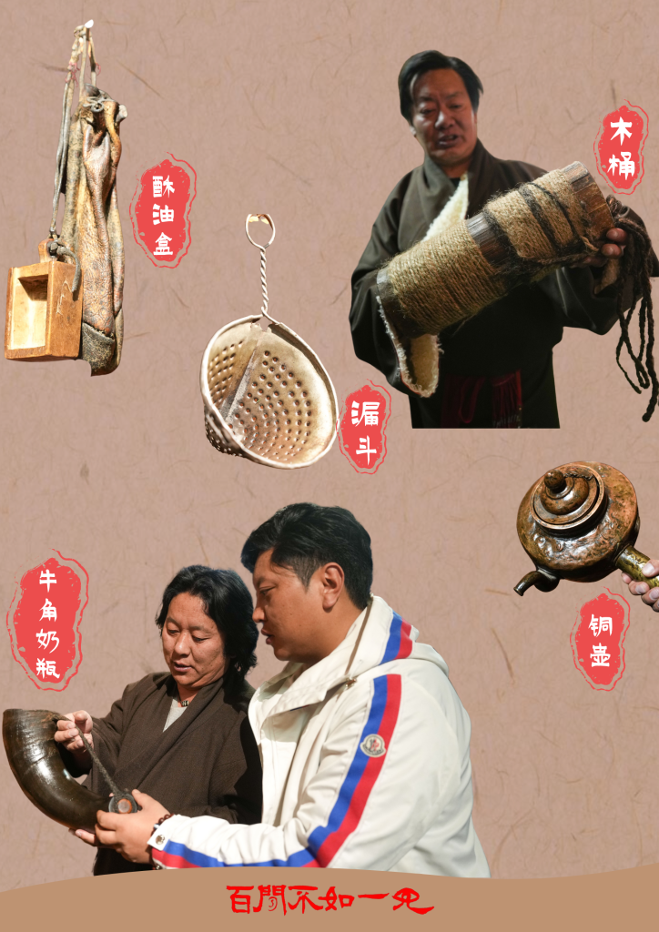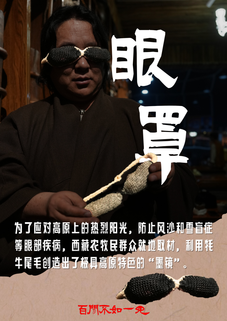 牦牛毛“墨镜”、牛皮茶包、便携酥油盒、给牛犊喂奶的牛角奶瓶……