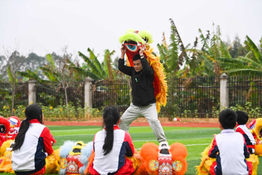2月18日,在广西兴业县第三实验小学,体育老师欧剑在教授舞狮的基本动作。