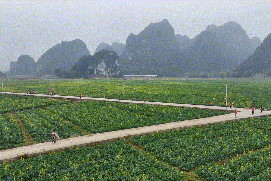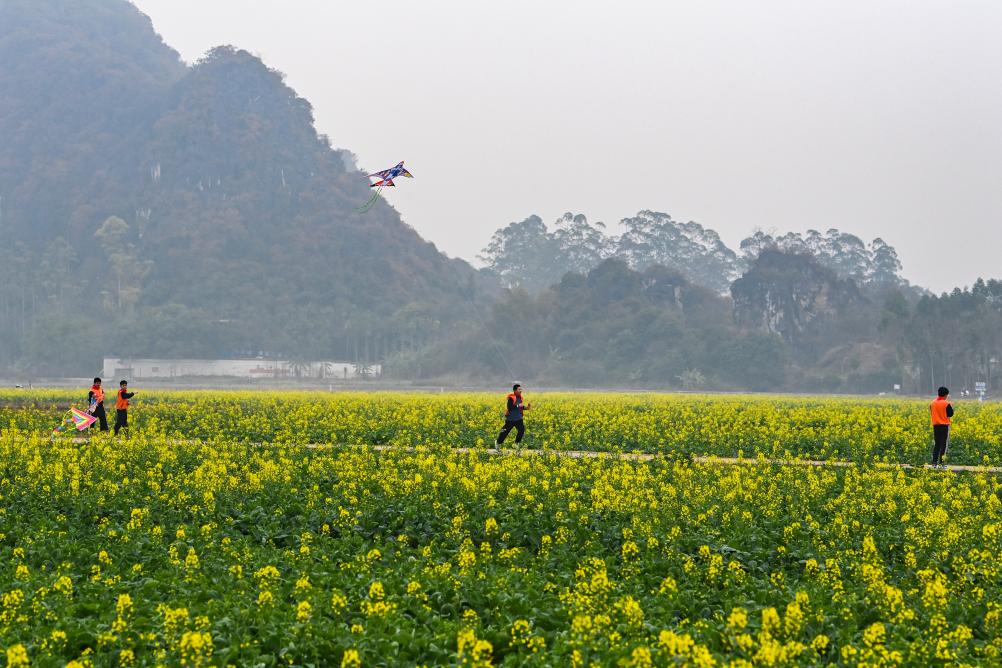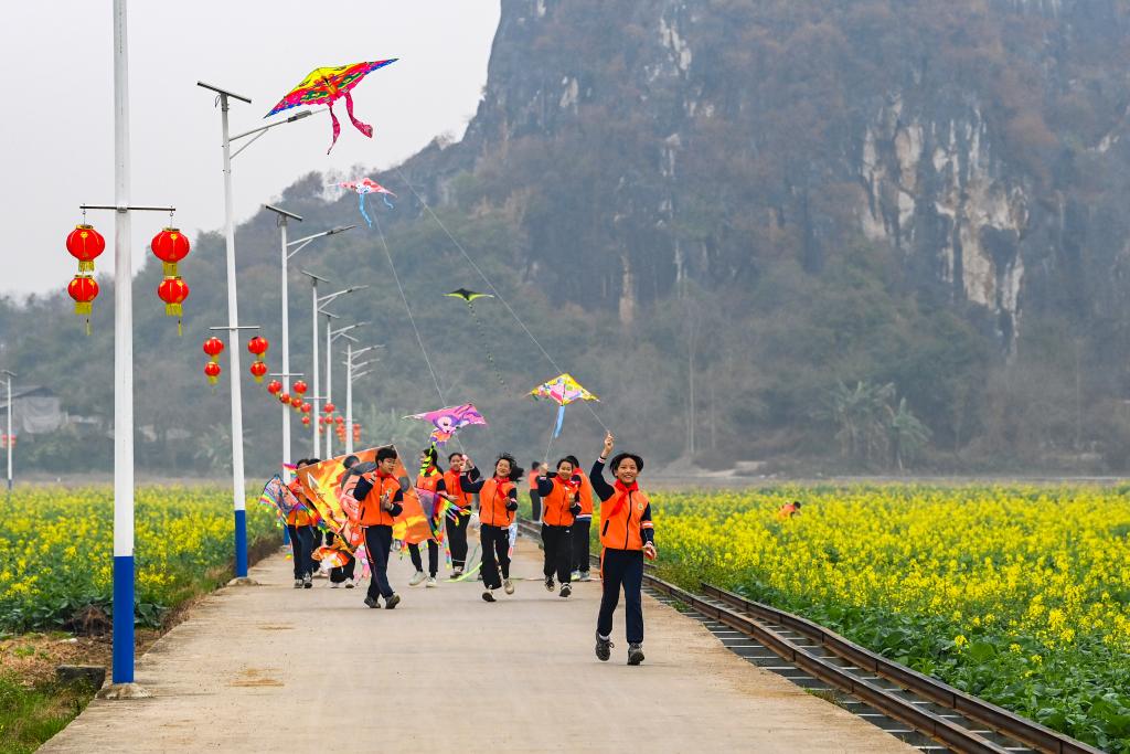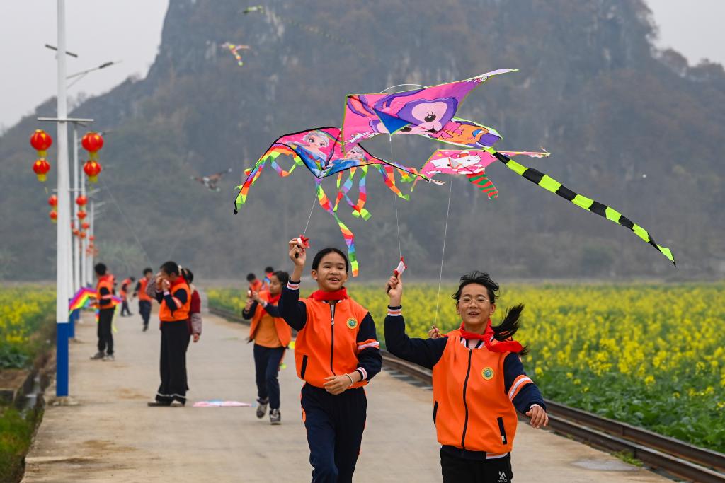 2月19日,在广西兴业县葵阳镇一处农田,泉江小学的学生们在机耕路上放风筝。