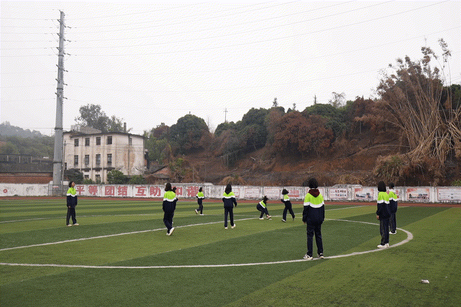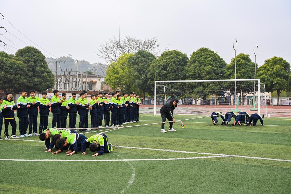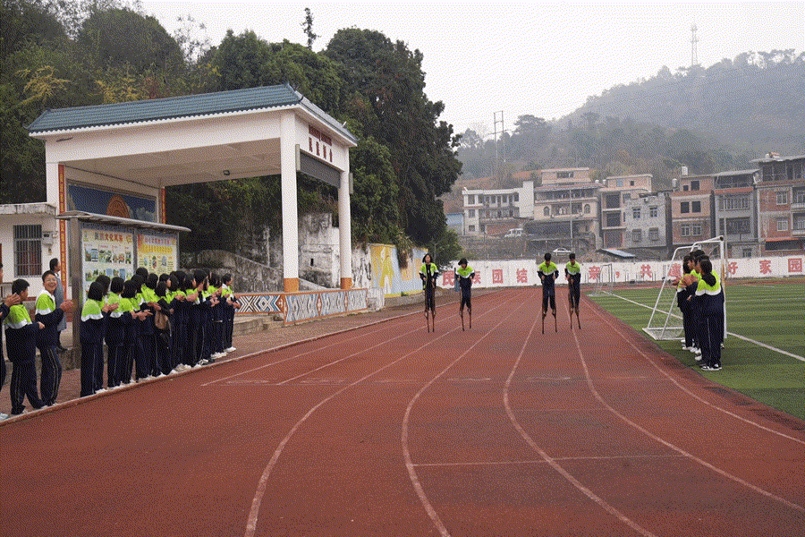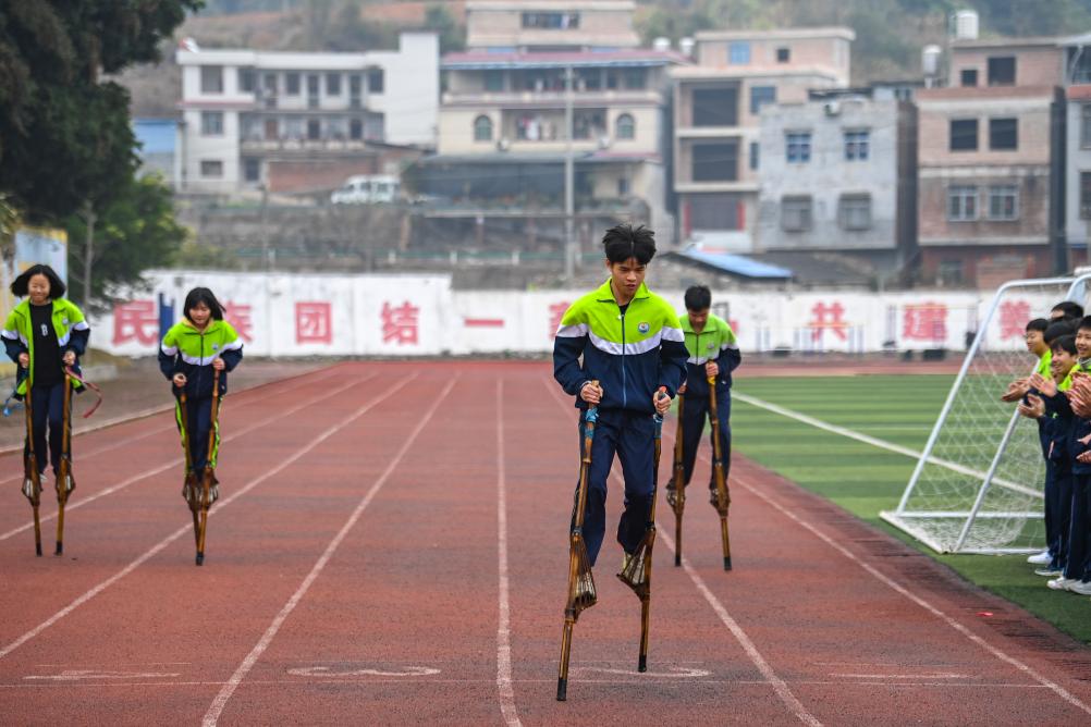 2月19日,在位于广西兴业县的玉林市民族中学,学生们在体育课上学习高脚竞速。