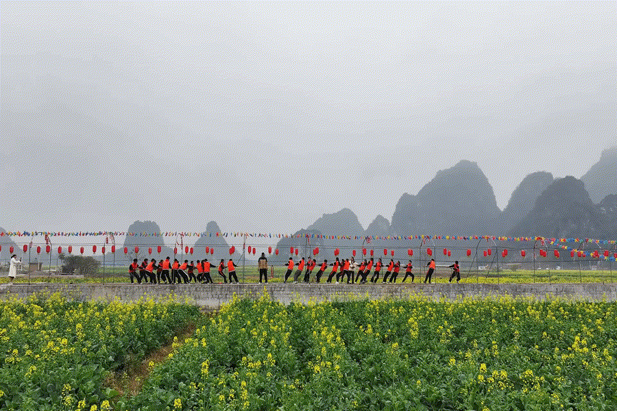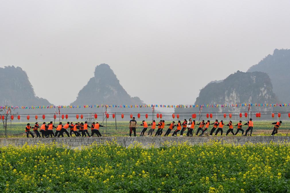 2月19日,在广西兴业县葵阳镇一处油菜花田边,泉江小学的学生们进行拔河比赛。