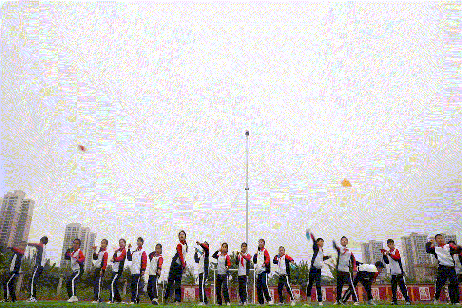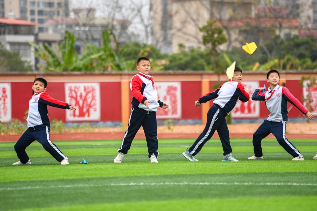 2月18日,在广西兴业县第三实验小学,学生们在体育课上投掷纸飞机。
