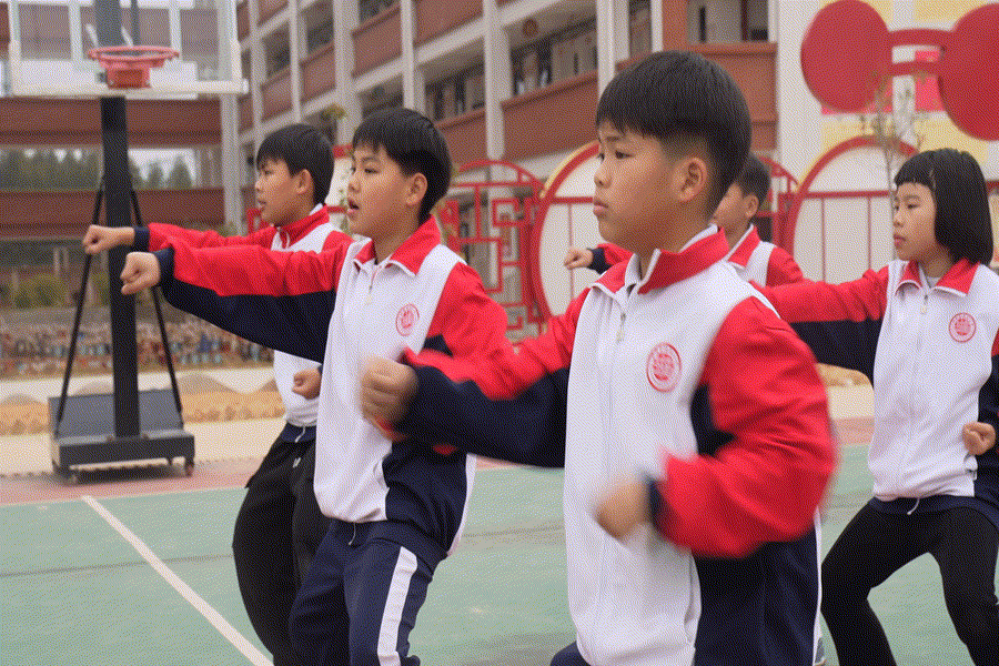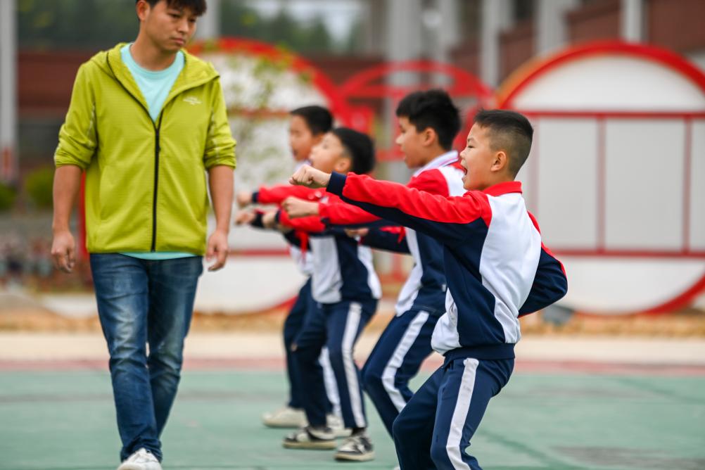 2月18日,在广西兴业县第三实验小学,体育老师李永奎(左一)带领学生练武术。