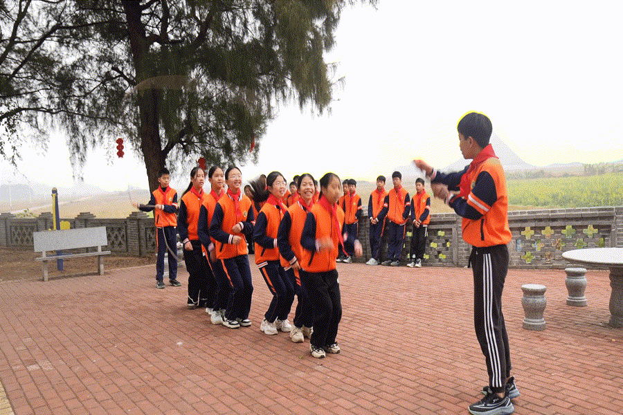 2月19日,在广西兴业县葵阳镇一处油菜花田边,泉江小学的学生们在体育老师庞捷光(中)的带领下跳绳热身。