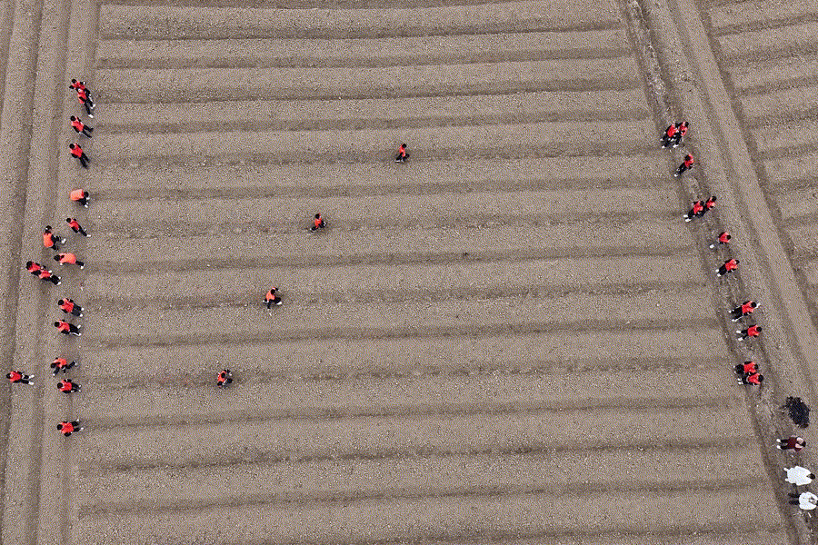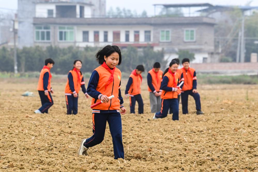2月19日,在广西兴业县葵阳镇一处农田,泉江小学的学生们在进行越野接力赛。