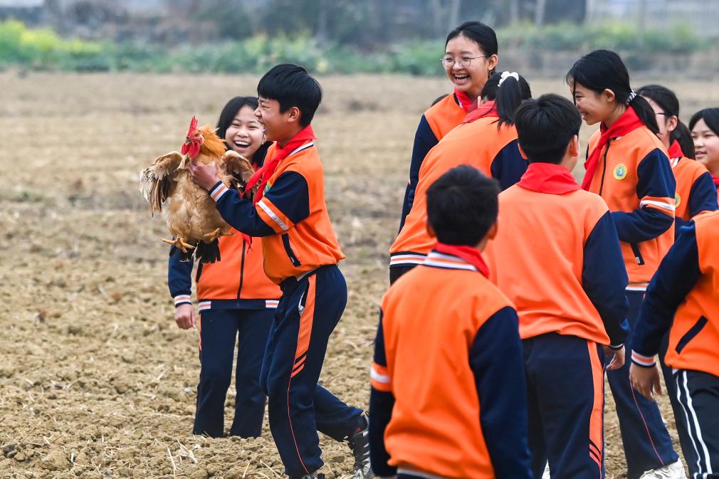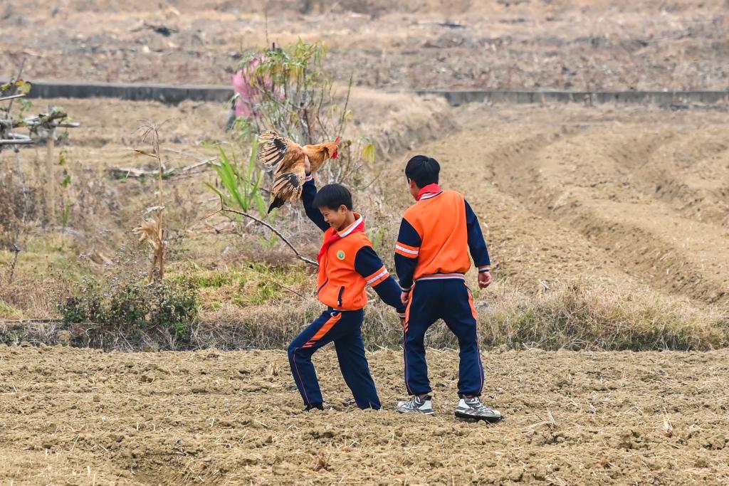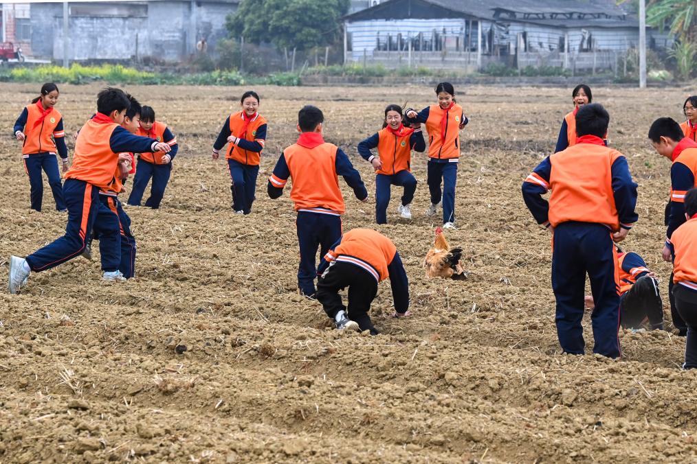 2月19日,在广西兴业县葵阳镇一处农田,泉江小学的学生们在进行抓鸡比赛。