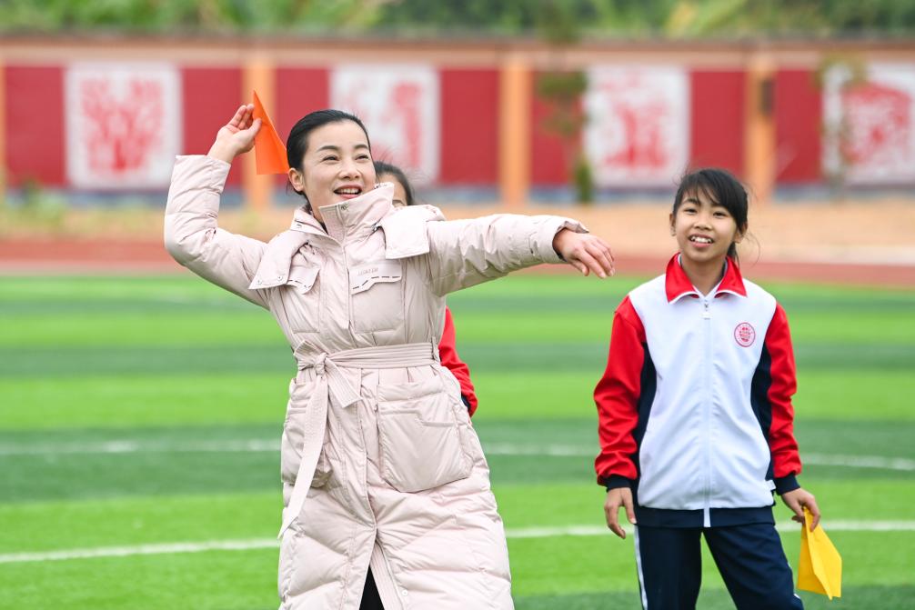 2月18日,在广西兴业县第三实验小学,校长梁嗣银(左)与学生们一起在体育课上投掷纸飞机。