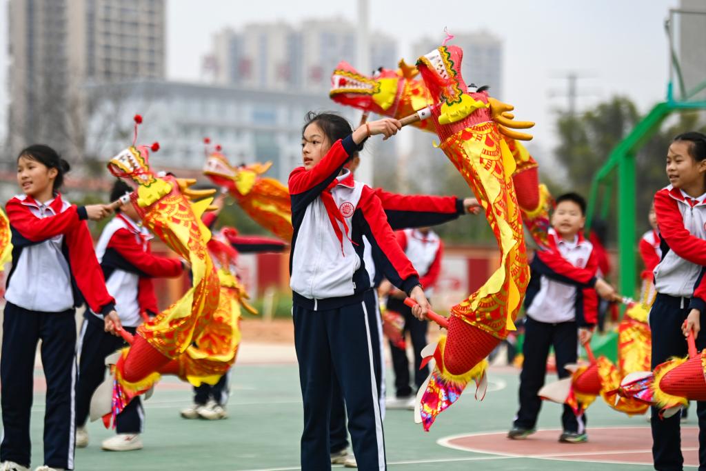 2月18日,在广西兴业县第三实验小学,学生们在体育课上练习单人舞龙。