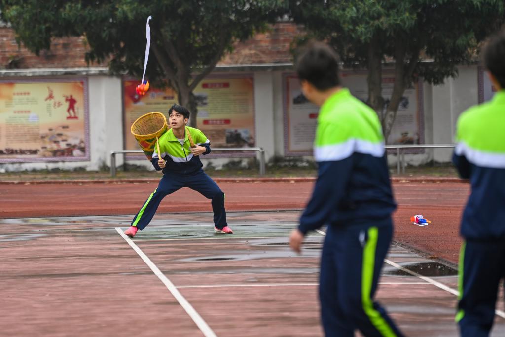 2月19日,在位于广西兴业县的玉林市民族中学,学生们在体育课上进行背篓绣球的比赛。