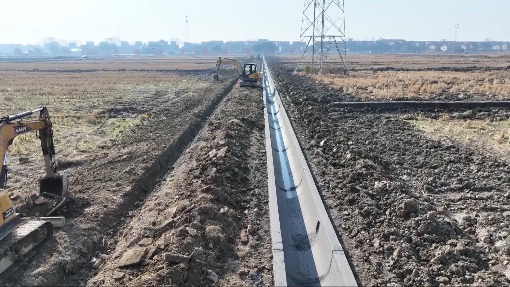 在资阳区沙头镇富兴村高标准农田建设现场,工人们正紧张有序地开挖渠道、安装渠槽。