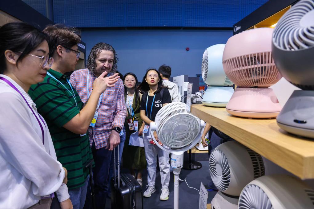 2024年4月15日,澳大利亚采购商在第135届广交会第一期的智慧生活展区了解智能风扇产品。新华社记者 刘大伟 摄