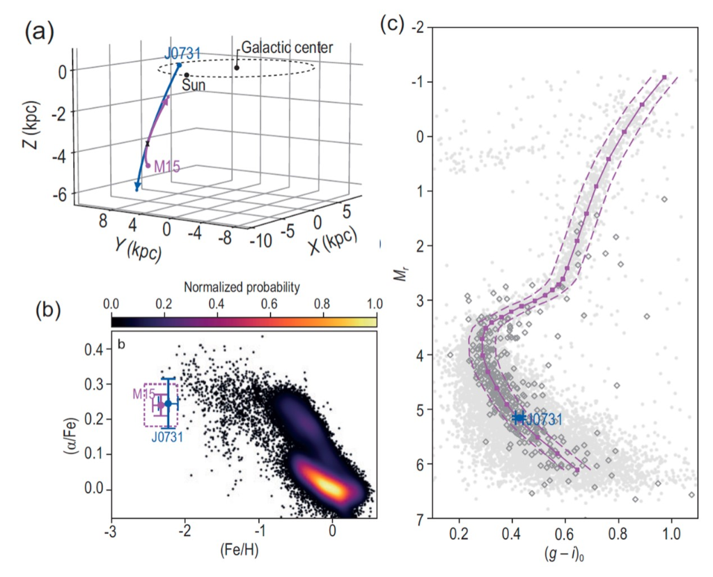此项研究中,团队基于欧洲航天局“盖亚”空间探测器和我国郭守敬望远镜等的观测数据,发现在约2000万年前,J0731+3717以接近每秒550公里的超高速度从M15中弹射而出,这颗星还有着与M15高度一致的化学丰度和年龄。
