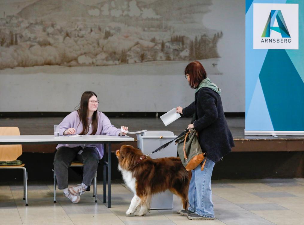 2月23日,在德国北莱茵-威斯特法伦州阿恩斯贝格,选民在一处投票站投票。新华社记者张帆摄