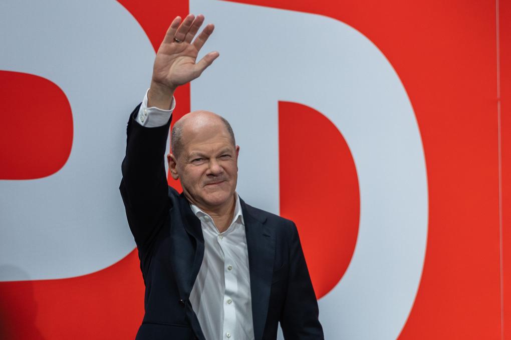 2月23日,在德国柏林的社会民主党总部,社会民主党总理候选人、现任总理朔尔茨出席竞选之夜活动。新华社发(乌尔里希·胡夫纳格尔摄)