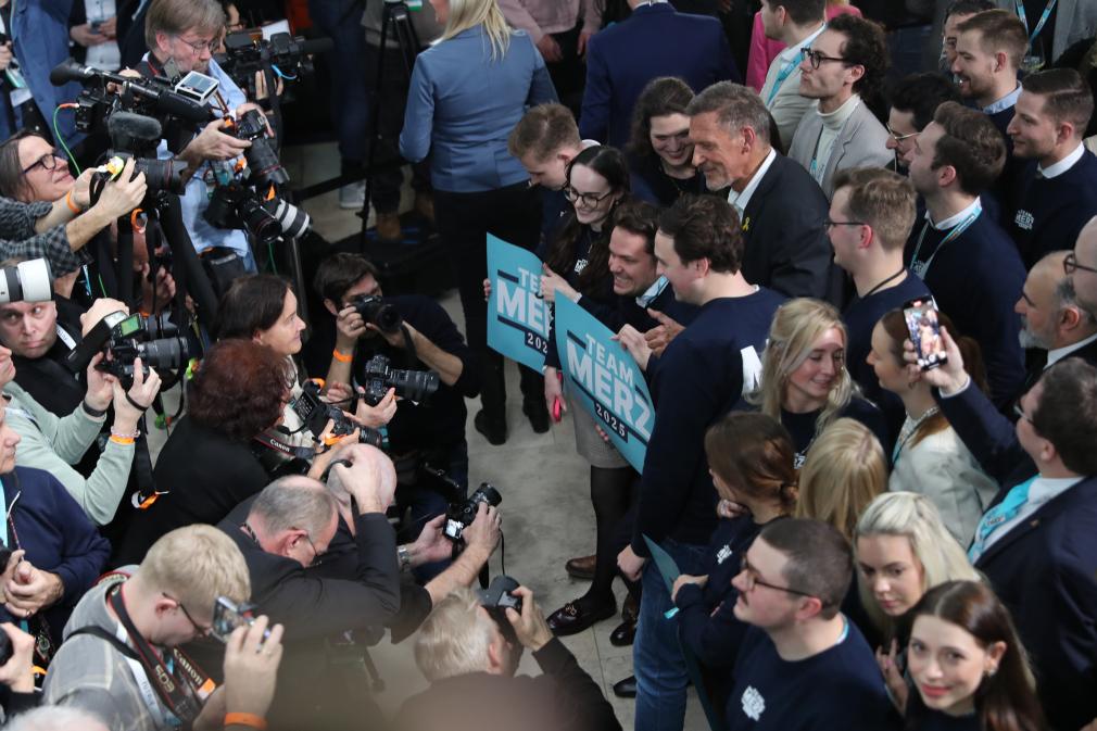 2月23日,在德国柏林的基督教民主联盟总部,联盟党总理候选人默茨(中)在出口民调显示领先后接受祝贺。新华社记者杜哲宇摄