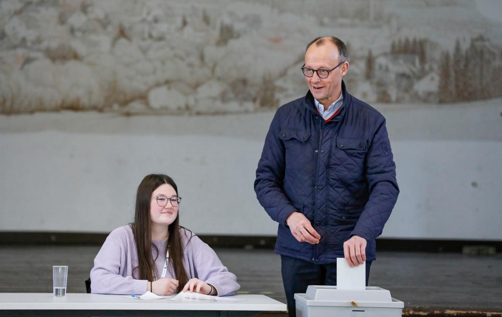 2月23日,在德国北莱茵-威斯特法伦州阿恩斯贝格,德国联盟党总理候选人默茨在一处投票站投票。新华社记者张帆摄