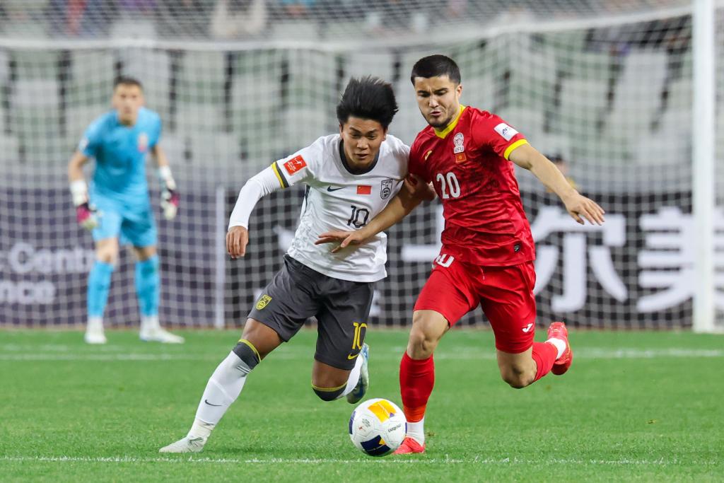 在2月15日进行的2025亚足联U20亚洲杯小组赛中国队对阵吉尔吉斯斯坦队比赛中,蒯纪闻(左)与对手拼抢。新华社记者梁旭摄