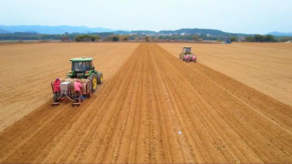 2月19日,在广西来宾市兴宾区凤凰镇国家现代农业产业园黄安优质“双高”糖料蔗基地,七台大型拖拉机、甘蔗种植机并列同步作业,蔗农有条不紊地往入口糟插入蔗苗,机器自动完成植苗、盖膜、覆土工作,不到15分钟,两垄长约200米的甘蔗全部种植完毕。