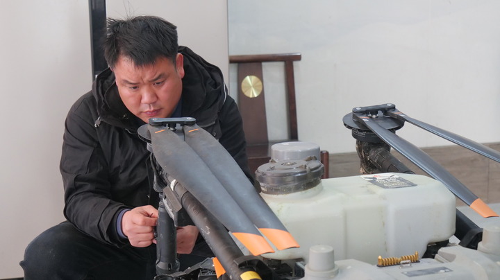 无人机“4S店”店主张子强和工作人员一个多小时就修好了无人机。张子强说,如今农民不仅要靠经验种田,还要懂技术、会经营。他每年都会组织技术人员为有意愿的农民进行无人机技术培训、讲解保养知识,已累计培训上千人次。