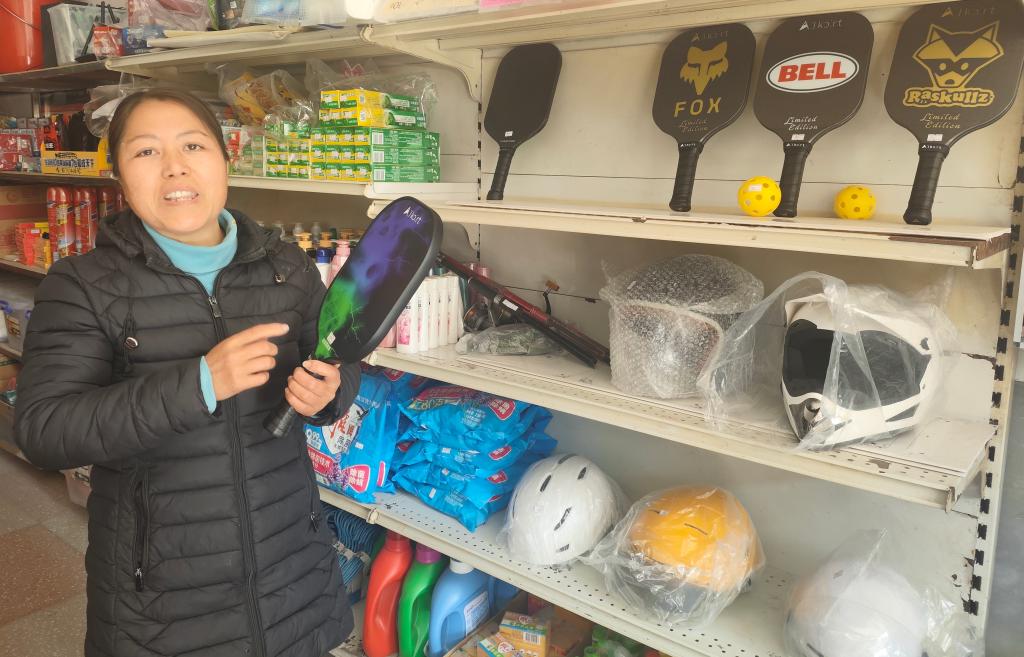 在江西省赣州市上犹县陡水镇月仔村,村民曾七凤正在介绍自家杂货店的匹克球拍。新华社记者姚子云 摄