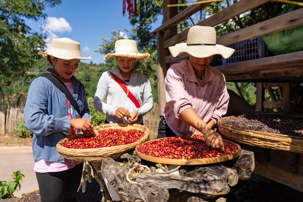 2024年10月30日,在云南省普洱市孟连傣族拉祜族佤族自治县桥安咖啡庄园,三名咖农在打理新采摘的咖啡鲜果。新华社记者 陈欣波 摄