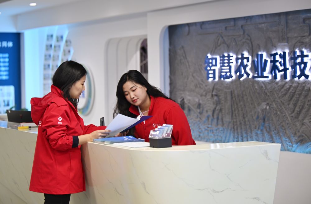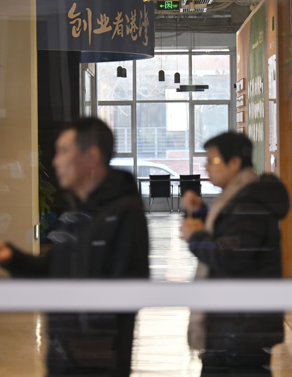 在位于天津滨海—中关村科技园的科芯(天津)生态农业科技有限公司,工作人员在互相交流(2月20日摄)。新华社记者李然摄