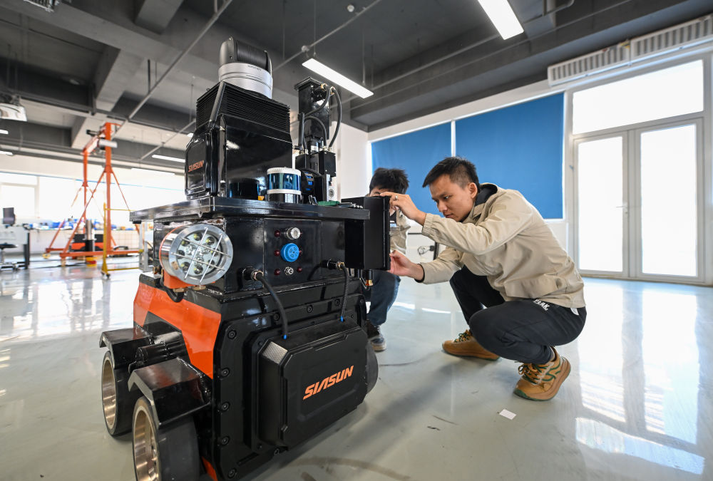 在位于京津中关村科技城的天津新松智能科技有限公司,工程师对一款矿井无人巡查机器人进行调试(2月20日摄)。新华社记者孙凡越摄