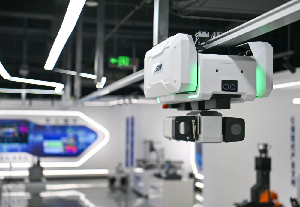 在位于京津中关村科技城的天津新松智能科技有限公司拍摄的一款轨道式无人值守机器人(2月20日摄)。新华社记者孙凡越摄
