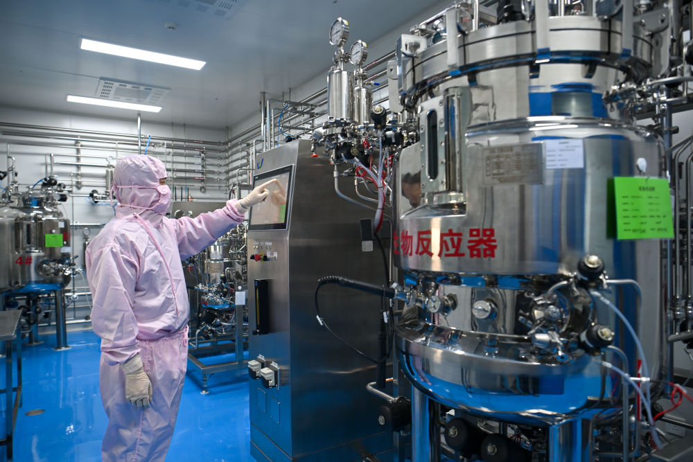 在位于京津中关村科技城的中科拜克(天津)生物药业有限公司,生产人员在生物制剂车间工作(2月20日摄)。新华社记者孙凡越摄